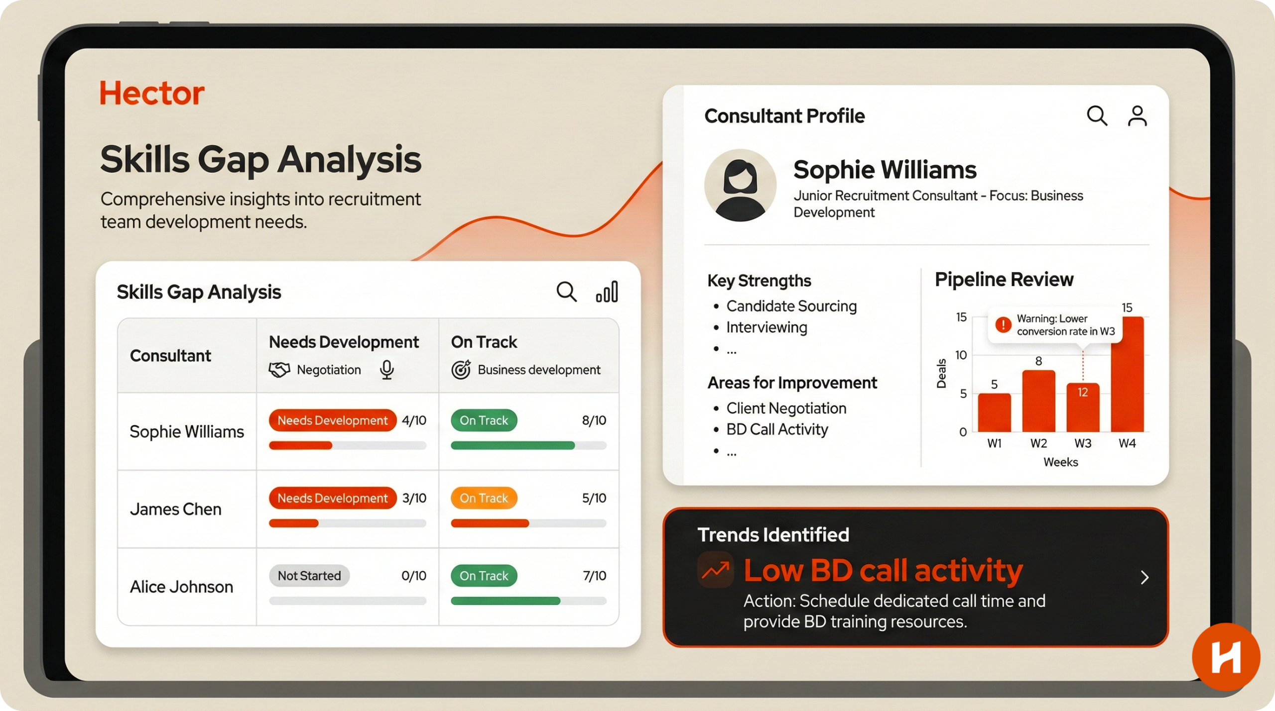 Hector turns “hit‑and‑miss” recruiters into consistent performers by standardising how your team works: common language, common process, and daily habits that drive reliable results